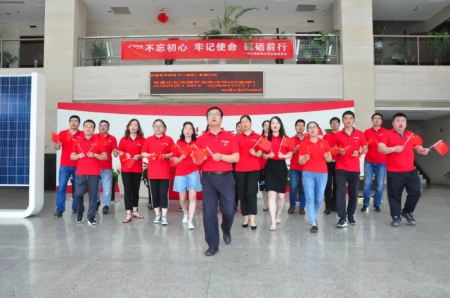 聽到熟悉的樂曲響起,阿特斯光伏電力(洛陽)有限公司的黨員們從各個辦公室走出,隨著節拍舞動手中的小國旗,帶著滿腔的熱忱、昂揚的斗志,高聲唱起“他指給了人民解放的道路,他引導中國走向光明......”